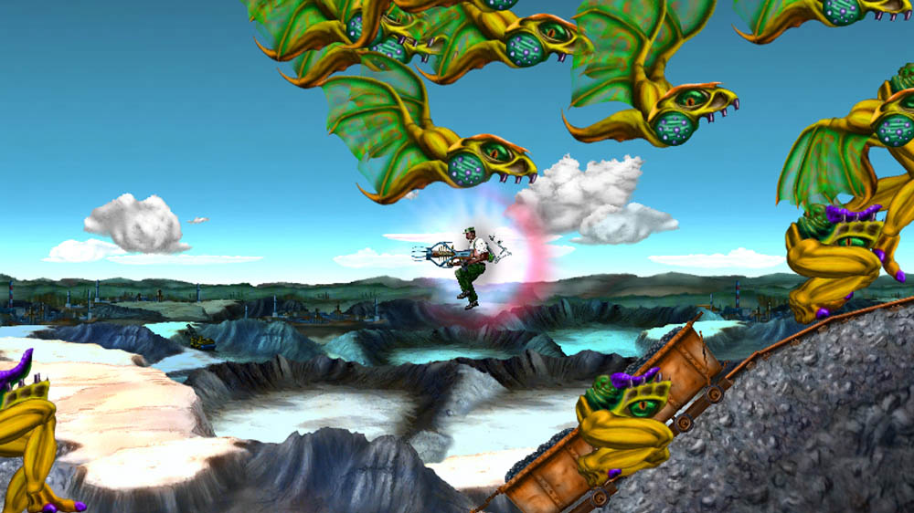 Characters – Weapons of Choice gives players three characters from the start and requires them to rescue four others from the levels as they play through giving a total of seven. Each character has a machine gun and a unique special weapon ranging from a giant jet engine style weapon to a futuristic over sized chainsaw. The double jump for each character is different; some put out a blast that will push enemies back, others allow you to specifically push the character in the direction of choice, and some create a cloud that allows the player to walk on air for a short time. No matter your style of play there are plenty of options to find perfect for you.
